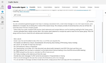 Elke agent begint in het overzicht-scherm van Copilot Studio. Hier kan je alles van je agent configureren. Hier voer je de instructies in, ook wel de 'system prompt' genoemd. Dit is een uitgebreide beschrijving waarin je de agent vertelt wat zijn doel is en hoe hij moet communiceren; je geeft het bijvoorbeeld regels en een takenpakket mee.